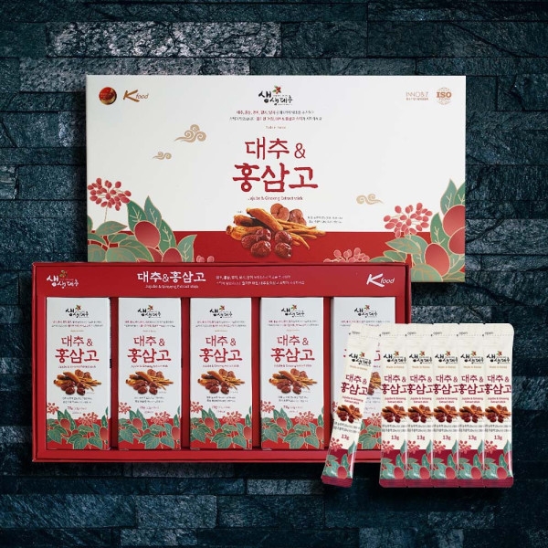 Thành phần: Nước chiết xuất hồng sâm [nước tinh chất hồng sâm Hàn Quốc ngâm đường gold (Hàn Quốc, hồng sâm 70%, fructose 25%, oligosacaride 5%) thành phần rắn 67%] 47,5%, nước cô đặc hỗn hợp thực vật 27,5%, nước táo tàu cô đặc 15%, chiết xuất hồng sâm 10%.