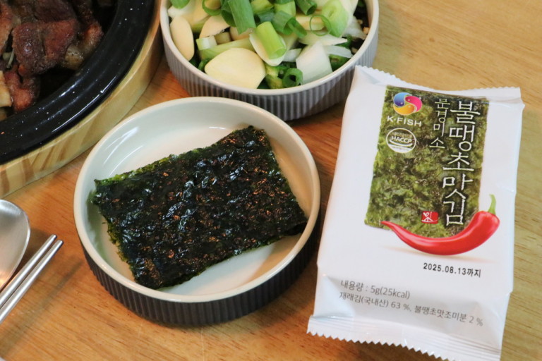 Thành phần: Rong biển truyền thống Hàn Quốc 63%, bột gia vị ớt cay Bulttaengcho 2%, dầu mầm ngô, dầu mè, muối